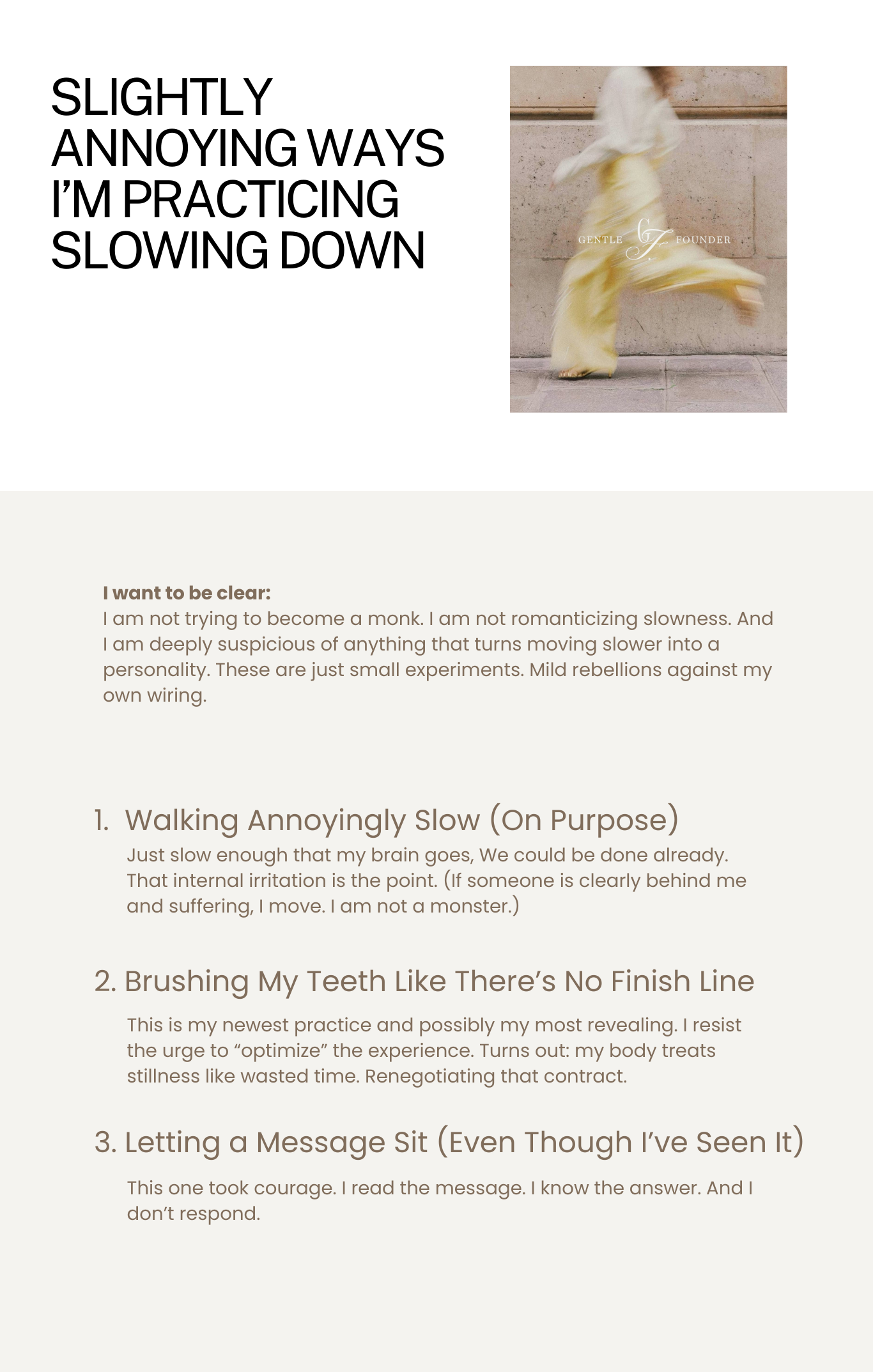 Nothing is on fire unless it’s actually on fire. And living next to that nervous-system neutrality made me realize something uncomfortable: A lot of my urgency wasn’t about efficiency, it was about control. (ugh, that “c” word still makes me uncomfortable to admit). If I move fast enough, nothing can catch me. If I decide quickly, I don’t have to sit with uncertainty. If I keep things moving, I don’t have to feel what’s underneath. That realization didn’t come with judgment. It came with a long exhale. Why am I doing this? It’s totally unnecessary!